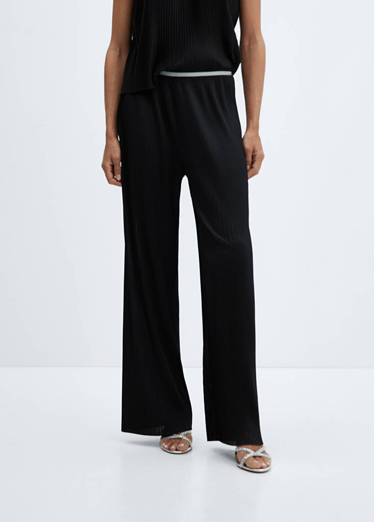 Flytende stoff. Wideleg design. Plissert design. Høy midje. Elastisk midje. Uten lukking. Kontrastkant. Total look. Dette plagget tilhører vår event-kolleksjon, designet for å gjøre deg til den perfekte gjesten på enhver fest, bryllup eller seremoni.