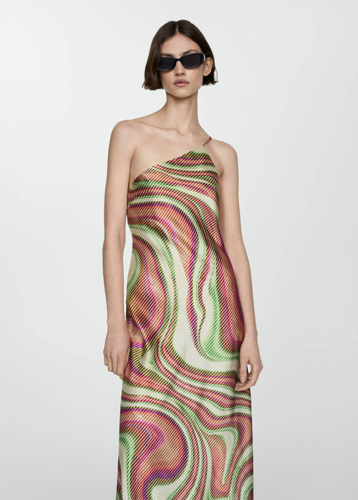 Flytende stoff. Satengstoff. Asymmetrisk design. Rett design. Langt design. Asymmetrisk krage. Tynn stropp. Uten lukking. Fest-, seremoni- og kommunionskolleksjon. Festival Season. Trykt design
