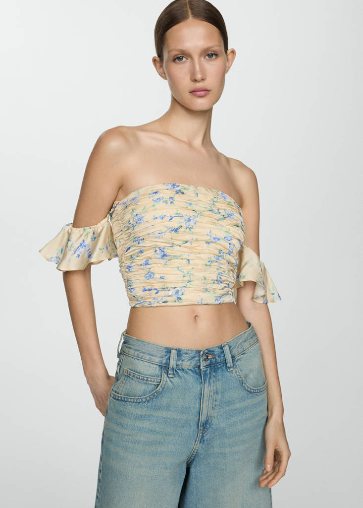 Flytende stoff. Rynket stoff. Crop-design. Blomstermønster. Bandeau. Korte ermer. Paljettdetalj. Glassperledetalj. Fest-, seremoni- og kommunionskolleksjon. Festival Season. Tettsittende design