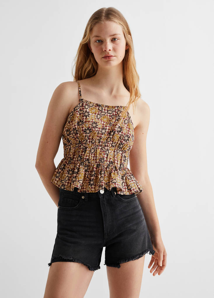 Stoff i 100% bomull. Frynset detalj. Cropped design. Tynne stropper. Rett design