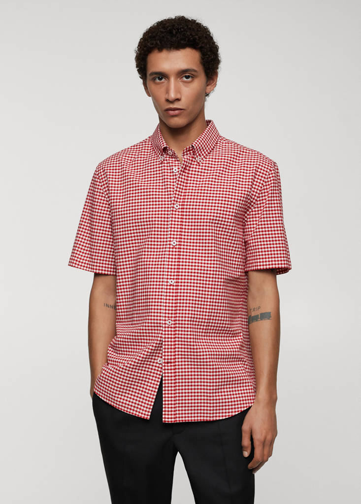 Lett stoff. Trykk med vichyruter. Kneppet krage. Korte ermer. Classic fit. 100% bomullsstoff. Rundet kant. Foran lukking med knapper
