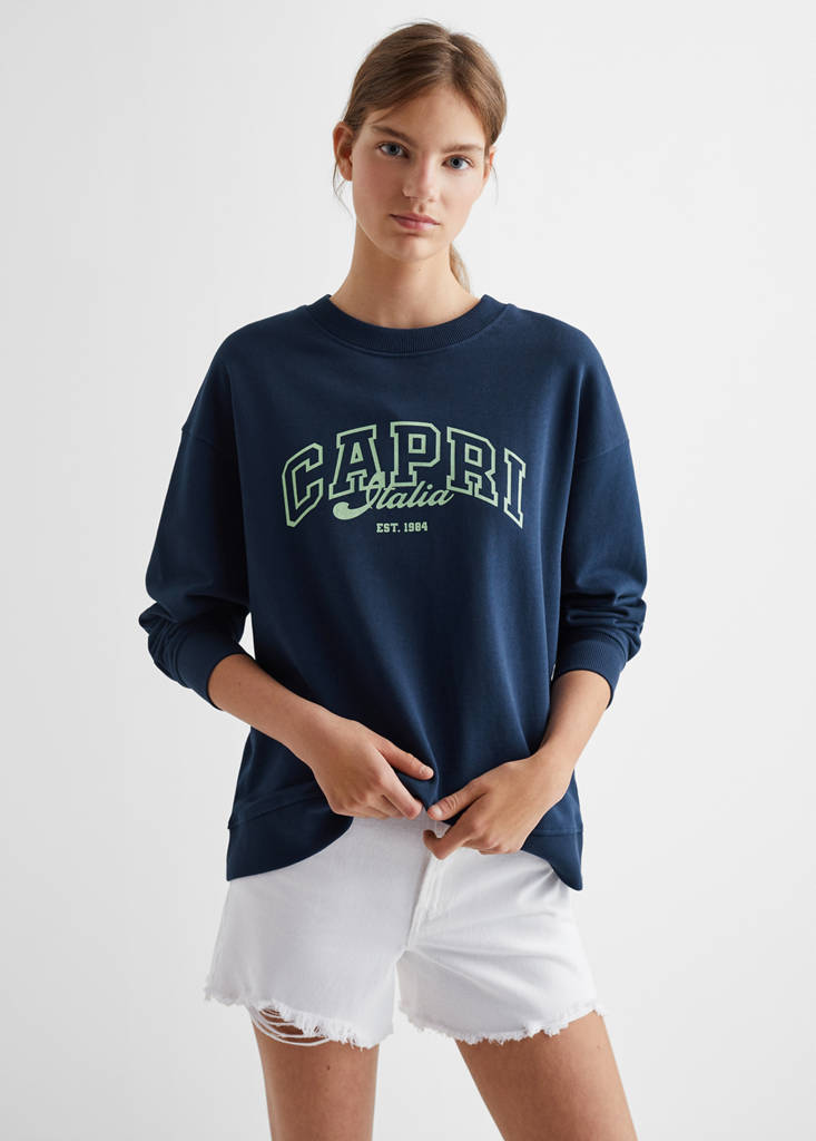 Tkanina z 100% bawełny. Nadruk tekstu. Model oversize. Okrągły dekolt. Długi rękaw. Modelka ma 172 cm wzrostu i nosi rozmiar M