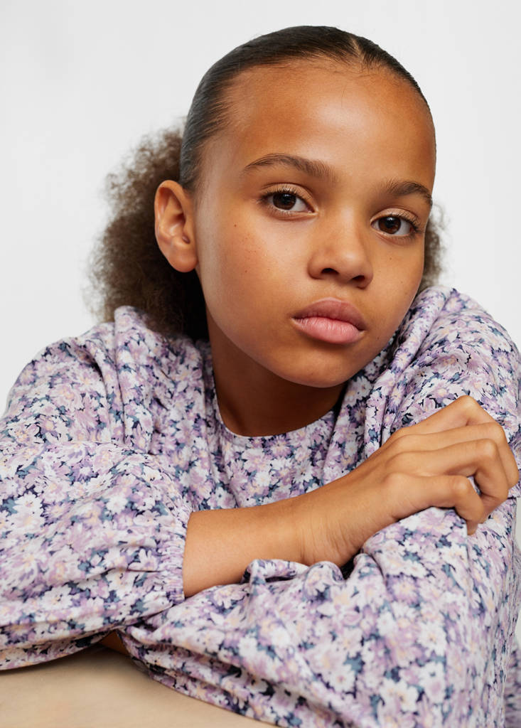 Lejąca tkanina. Kwiatowy wzór. Model evasé. Okrągły dekolt. Długi bufiasty rękaw. Elastyczne mankiety. Zapięcie z tyłu na guziki