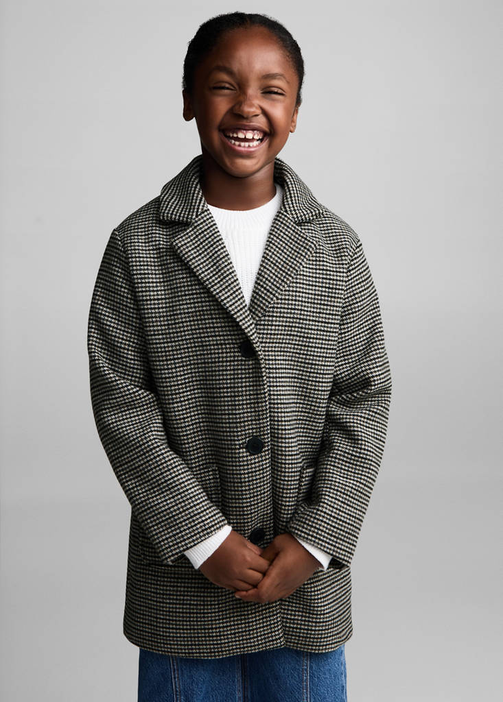 Tkanina z wełny. Prosty krój. Długi fason. Wzór kurza stopka. Kołnierz koszulowy. Długi rękaw. Dwie kieszenie z przodu. Zapięcie na guziki z przodu
