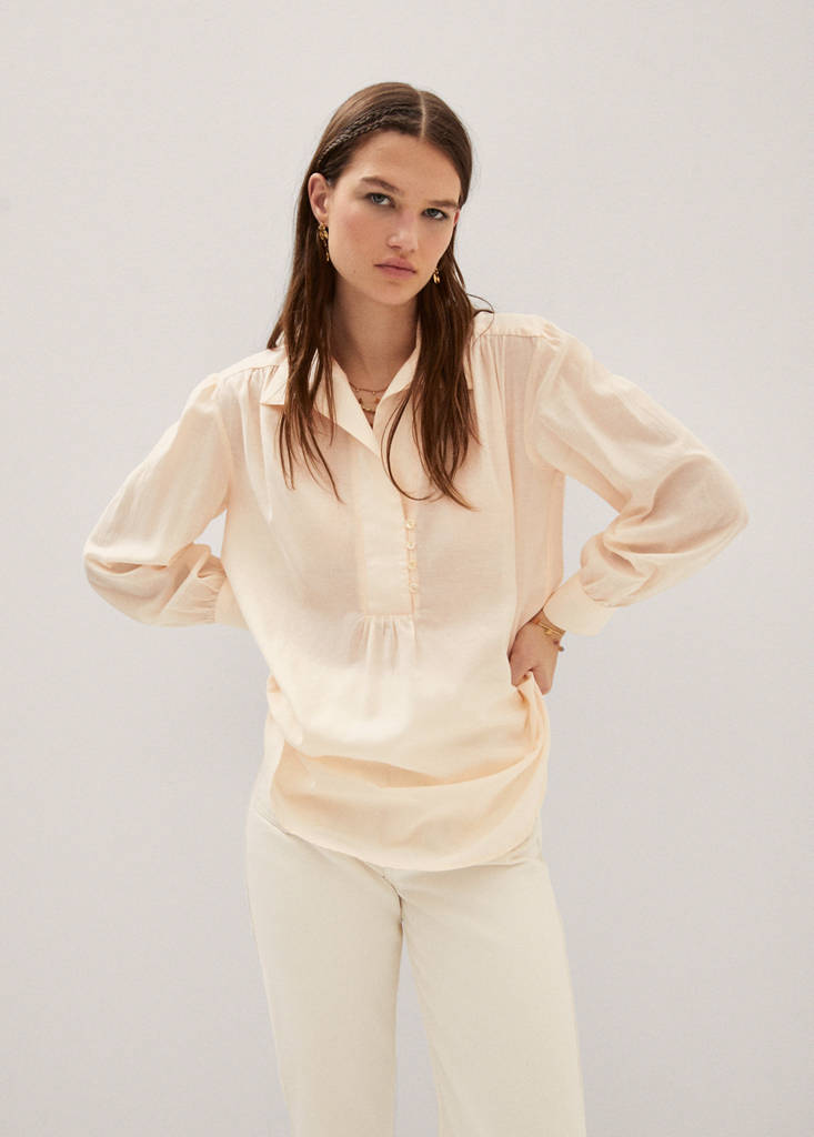Tkanina mieszanka bawełny. Model oversize. Koszulowy kołnierz. Dekolt V z guzikami. Długi rękaw z guzikami na mankietach. Bez zapięcia. Marszczona tekstura