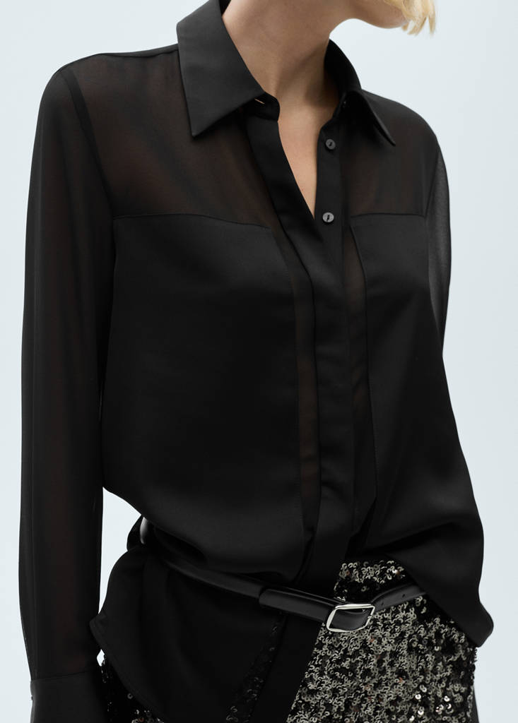 Tkanina z szyfonu. Lekka tkanina. Prosty krój. Kołnierz koszulowy. Długi rękaw z zapięciem na guziki. Zapięcie na guziki z przodu
