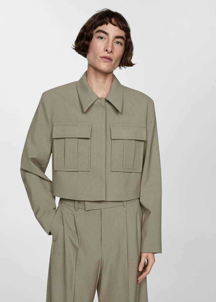 Krój crop. Prosty krój. Kołnierz koszulowy. Długi rękaw. Dwie naszywane kieszenie z patką na piersi. Kryte zapięcie na guziki z przodu. Wewnętrzna podszewka. Total look. Stylizacje biurowe