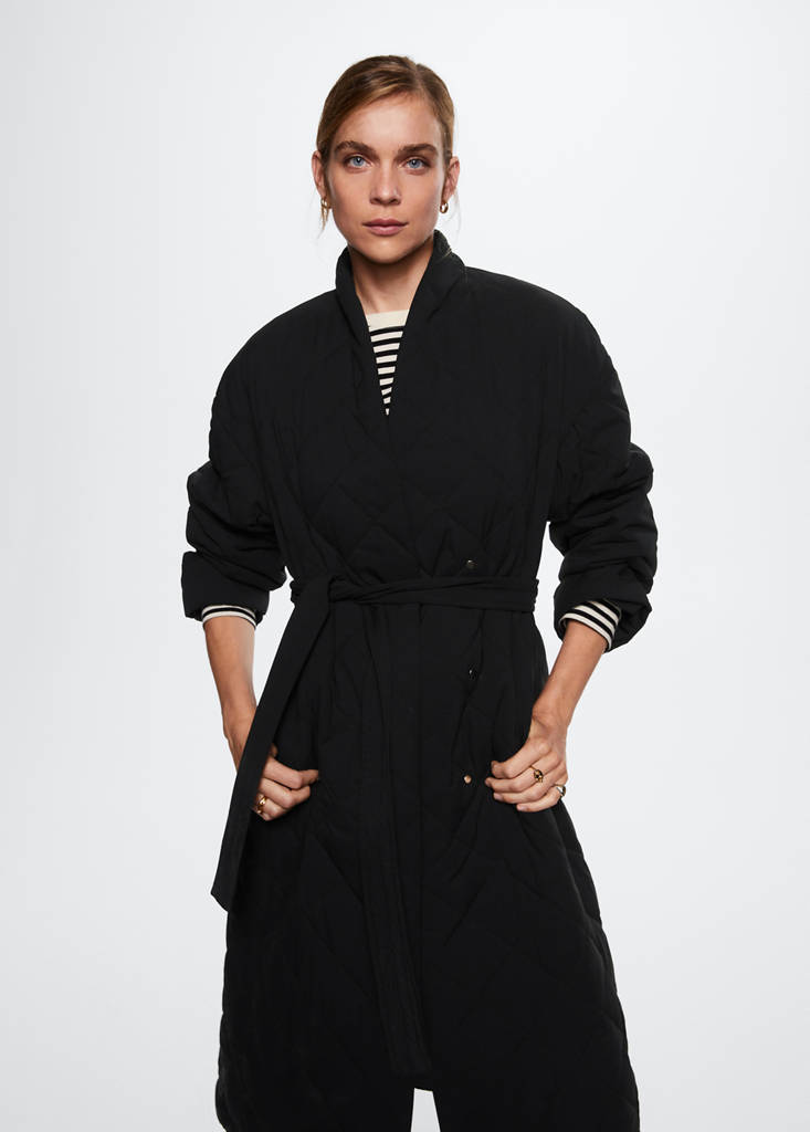 Lekki płaszcz puchowy. Pikowany design. Krój kopertowy. Design oversize. Długi fason. Dekolt w szpic z kołnierzykiem. Ramiona z obniżonym szwem. Długi rękaw. Kieszenie boczne zapinane na suwak. Regulowany pasek. Z wypełnieniem. Wewnętrzna podszewka. Zapięcie na zatrzaski. Water Repellent: trwałe wykończenie tego modelu chroni przed lekkim deszczem, odpycha cząsteczki wody i krople deszczu