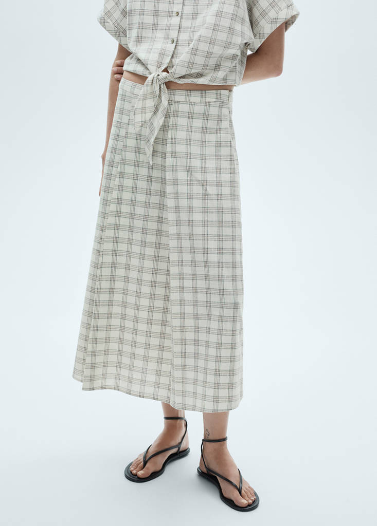 Lekka tkanina. Krój trapezowy. Krój crop. Wzór w kratę. Wysoki stan. Ozdobne szwy. Boczne zapięcie na suwak. Bez podszewki