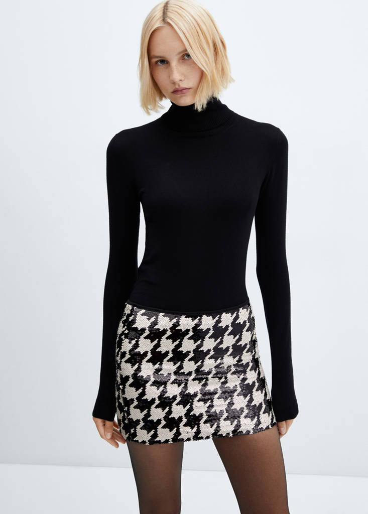 Cekinowa tkanina. Projekt krótki. Prosty krój. Wzór kurza stopka. Kryte zapięcie na suwak z boku. Wewnętrzna podszewka. Kolekcja na przyjęcia, uroczystości i komunie