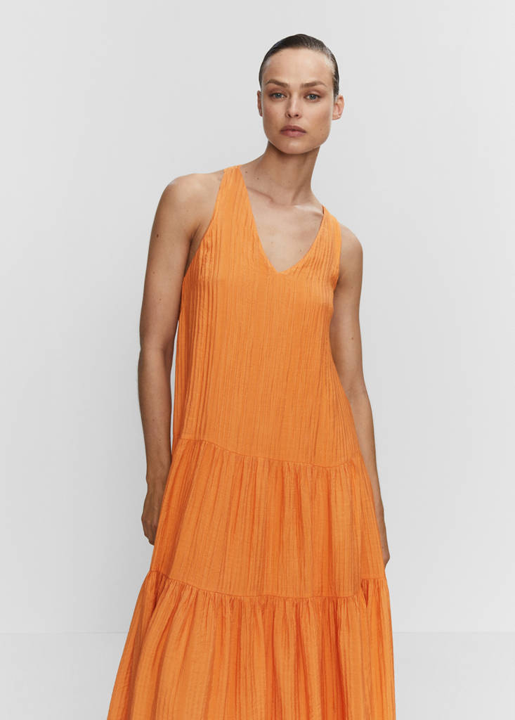 Teksturowana tkanina, lejąca tkanina, model evasé, model długi, dekolt V, szerokie ramiączka skrzyżowane na plecach, dekolt na plecach, ozdobne wiązanie na plecach, falbana u dołu, bez zapięcia.