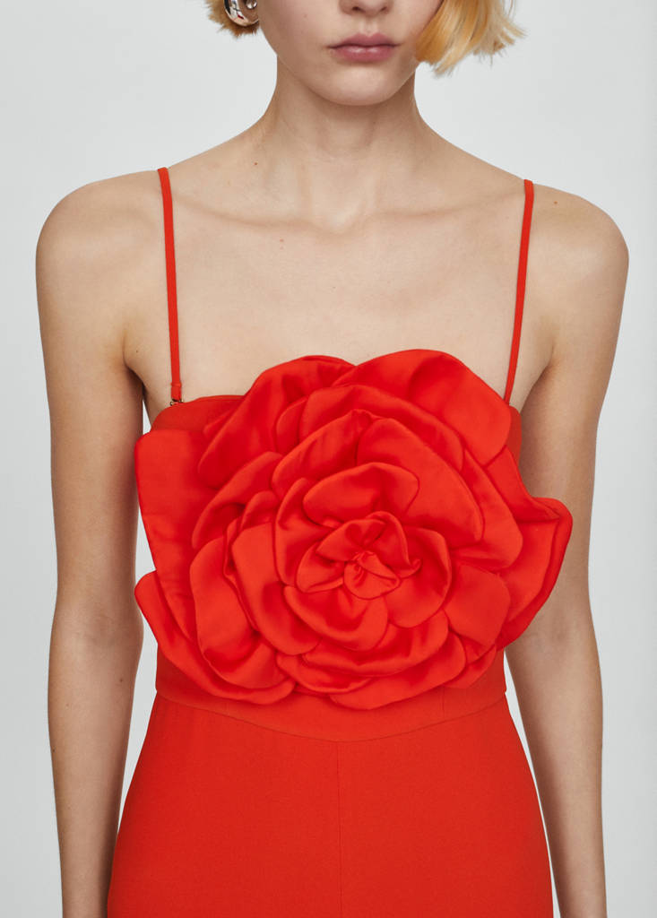 Lekka tkanina. Długi fason. Prosty krój. W kształcie dużego kwiatu. Dekolt typu bandeau. Cienki regulowany pasek. Odpinane szelki. Zapięcie z tyłu na kryty suwak. Wewnętrzna podszewka. Kolekcja na przyjęcia, uroczystości i komunie. Ta odzież należy do naszej kolekcji na wydarzenia, zaprojektowanej, aby uczynić Cię idealnym gościem na każdej imprezie, weselu czy ceremonii.