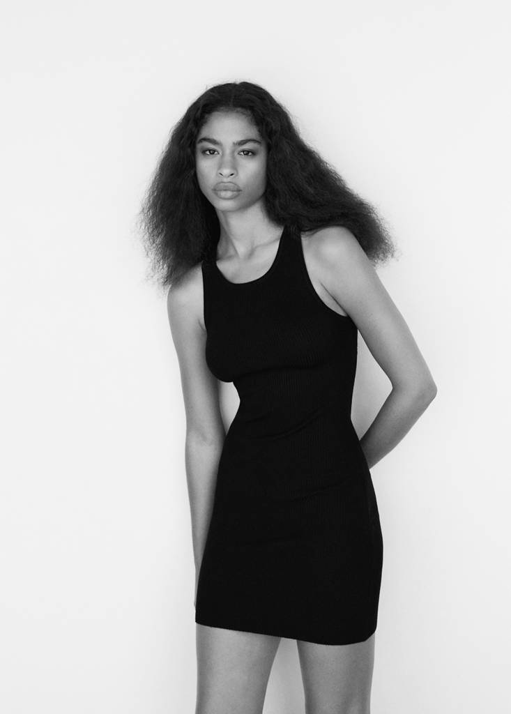 Dzianina. Projekt krótki. Okrągły dekolt. Szerokie ramiączka. Dekolt na plecach. Bez zapięcia. Projekt dopasowany