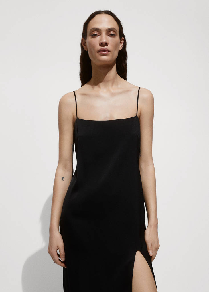 Lekka tkanina. Prosty krój. Krój midi. Kwadratowy dekolt. Bez rękawów. Cienkie ramiączka. Bez podszewki. Bez zapięcia. Szczegół rozcięcia