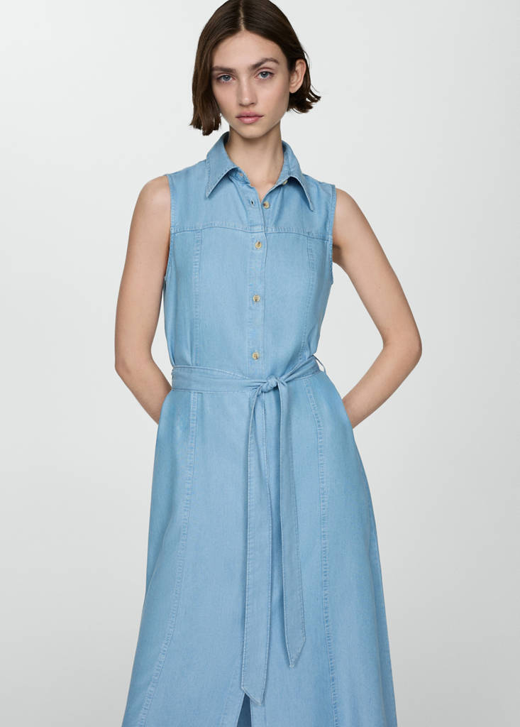 Tkanina z lyocellu. Tkanina bambula. Krój midi. Krój trapezowy. Kołnierz koszulowy. Bez rękawów. Szlufki. Regulowane wiązanie w talii. Zapięcie na guziki z przodu