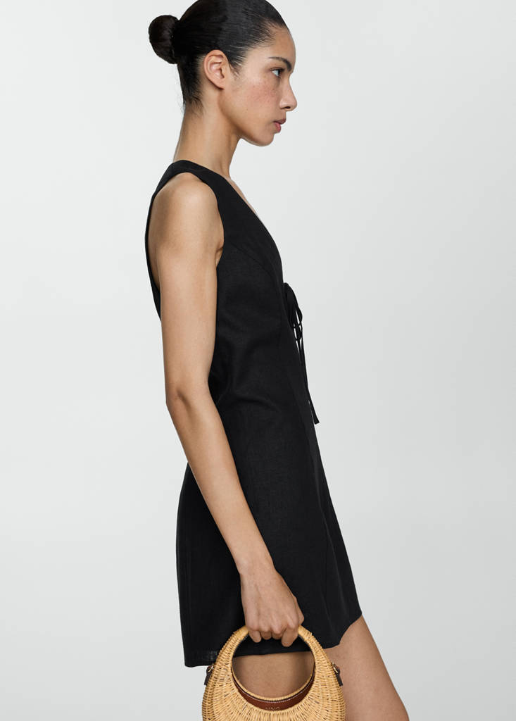 Tkanina z domieszką lnu. Projekt krótki. Prosty krój. Dekolt w serek. Bez rękawów. Szerokie ramiączka. Zapięcie z tyłu na kryty suwak. Ozdobna kokardka. Wewnętrzna podszewka. Dostępne Plus