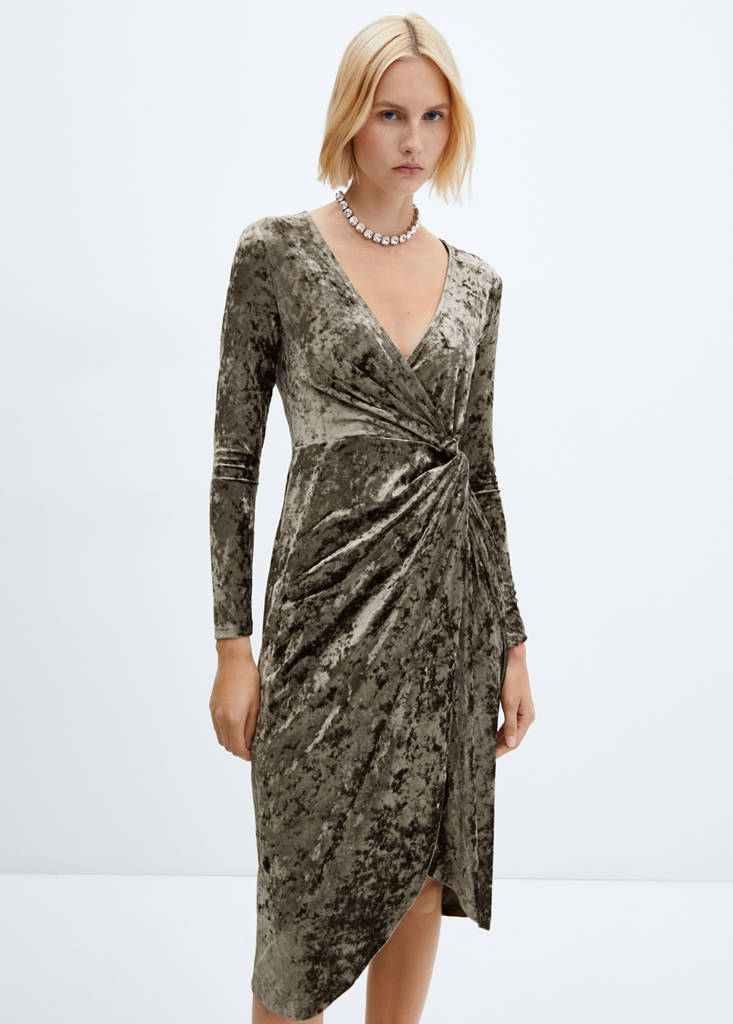 Aksamitna tkanina. Krój midi. Krój kopertowy. Dekolt w serek. Długi rękaw. Bez zapięcia. Ozdobny węzeł. Kolekcja na przyjęcia, uroczystości i komunie