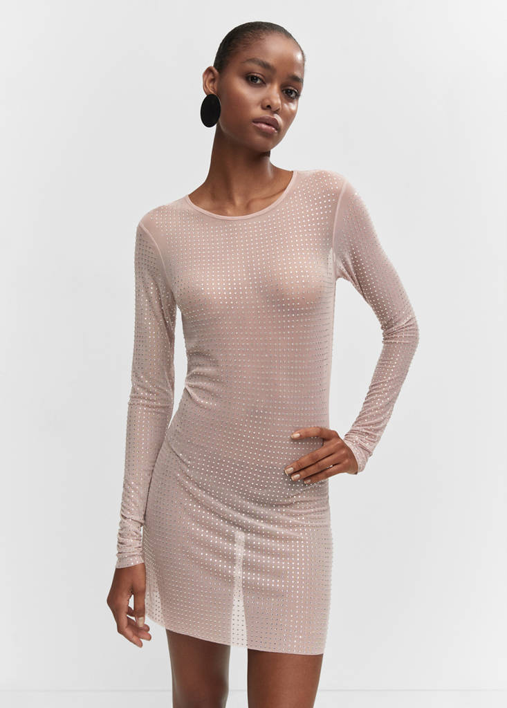 Tkanina siatkowa. Aplikacja z kryształków. Projekt krótki. Okrągły dekolt. Długi rękaw. Bez zapięcia. Kolekcja na przyjęcia, uroczystości i komunie. Sezon festiwalowy. Projekt dopasowany