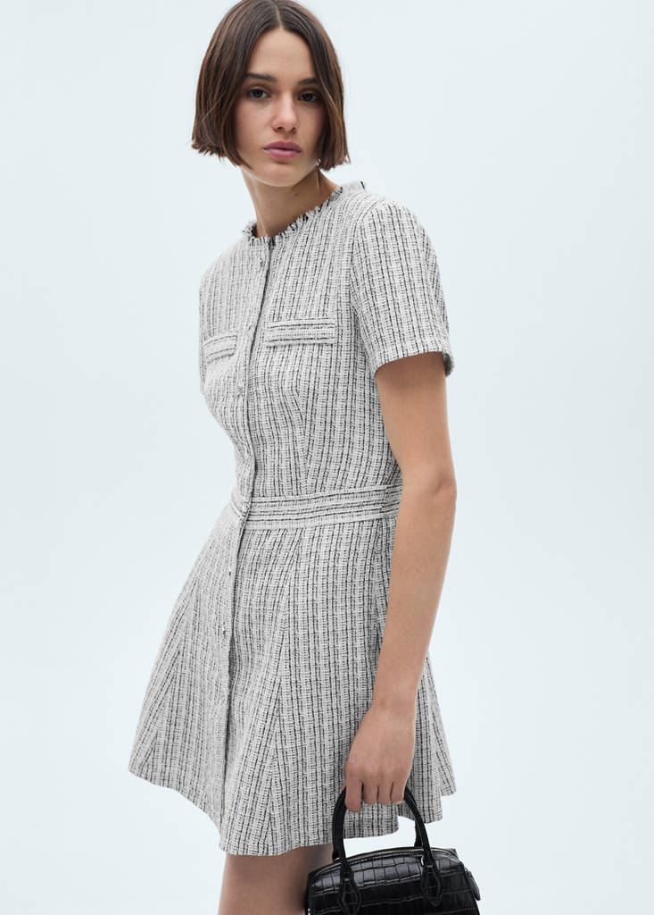 Tkanina tweedowa. Projekt krótki. Krój trapezowy. Okrągły dekolt. Krótki rękaw. Dwie przednie kieszenie z lamówką. Wewnętrzna podszewka. Zapięcie na guziki z przodu