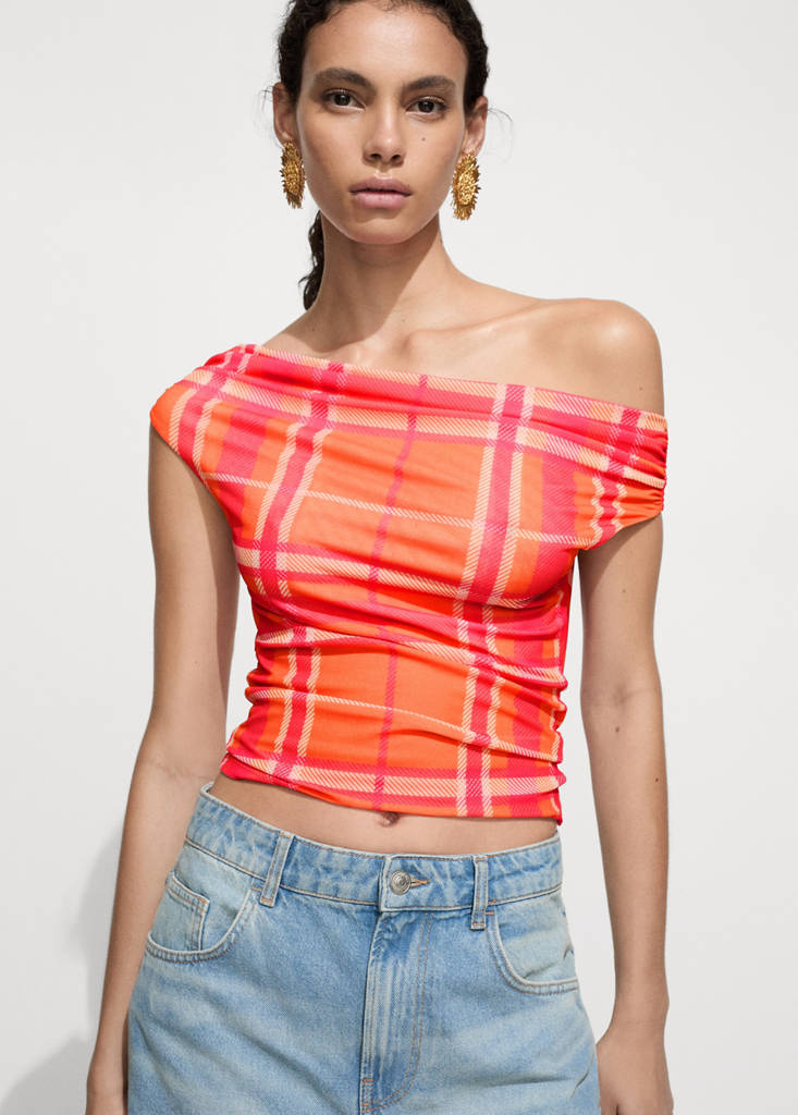 Tkanina elastyczna. Krój crop. Wzór w kratę. Dekolt typu łódka. Krótki rękaw. Bez zapięcia. Sezon festiwalowy. Projekt dopasowany