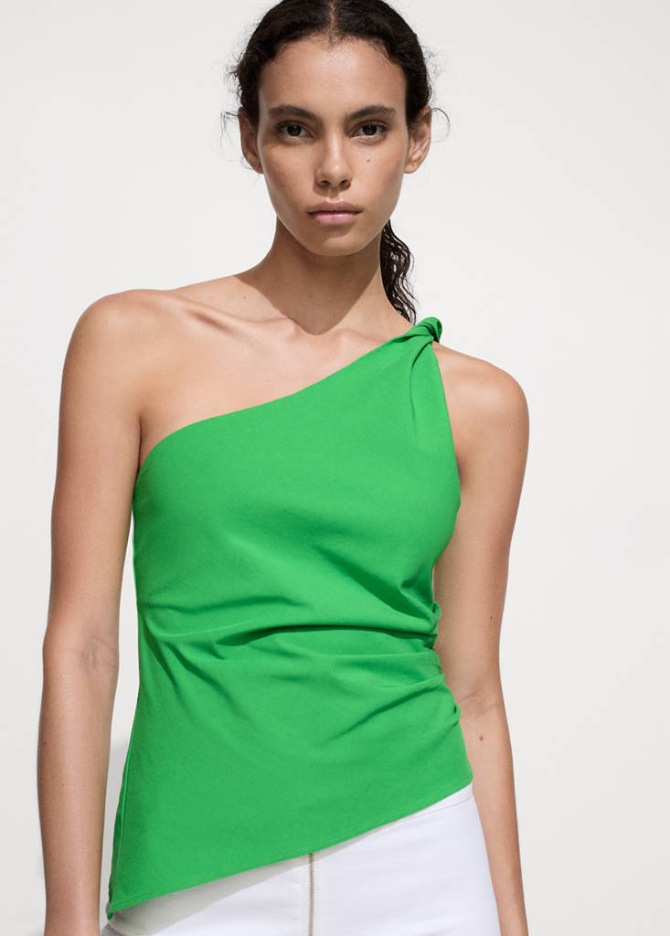 Asymetryczny design. Bez rękawów. Szerokie ramiączko. Drapowany detal. Projekt dopasowany