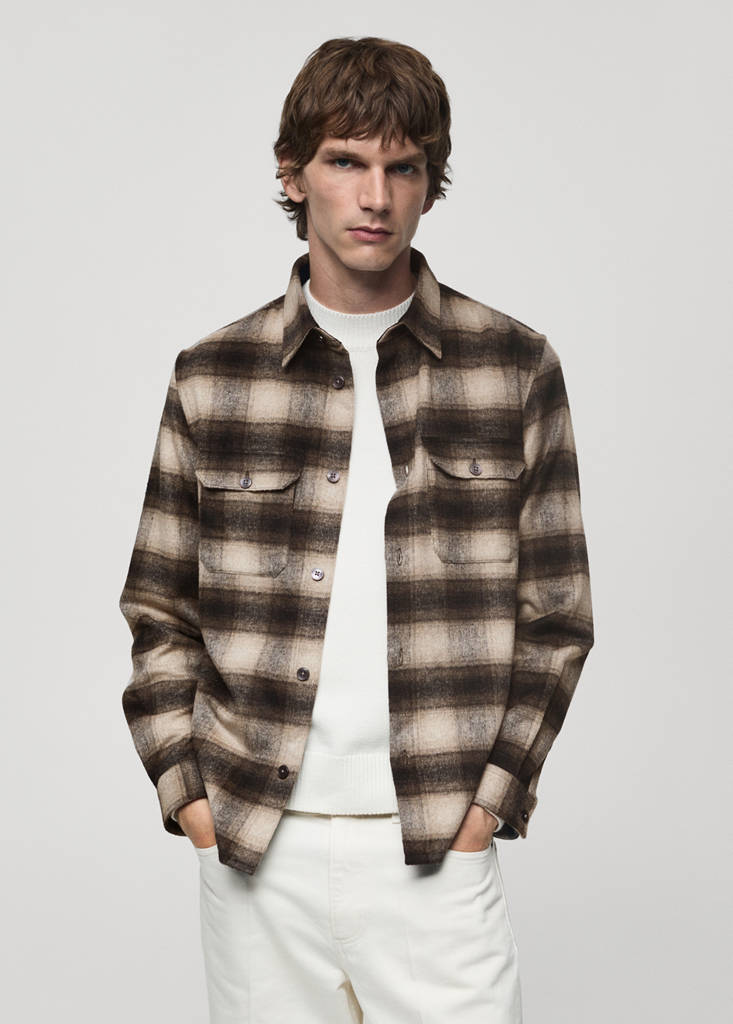 Regular fit. Tkanina mieszanka wełny. Tkanina flanelowa. Wzór w kratkę. Klasyczny kołnierzyk. Dwie naszywane kieszenie z patkami i guzikiem na piersi. Zapięcie na guziki z przodu. Długi rękaw z mankietami zapinanymi na guziki. Zaokrąglony dół