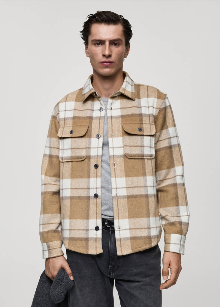 Tkanina flanelowa. Wzór w kratkę. Dwie naszywane kieszenie z patkami na guzik z przodu. Mankiety zapinane na guziki. Kołnierz koszulowy. Zapięcie na guziki. Zaokrąglony dół