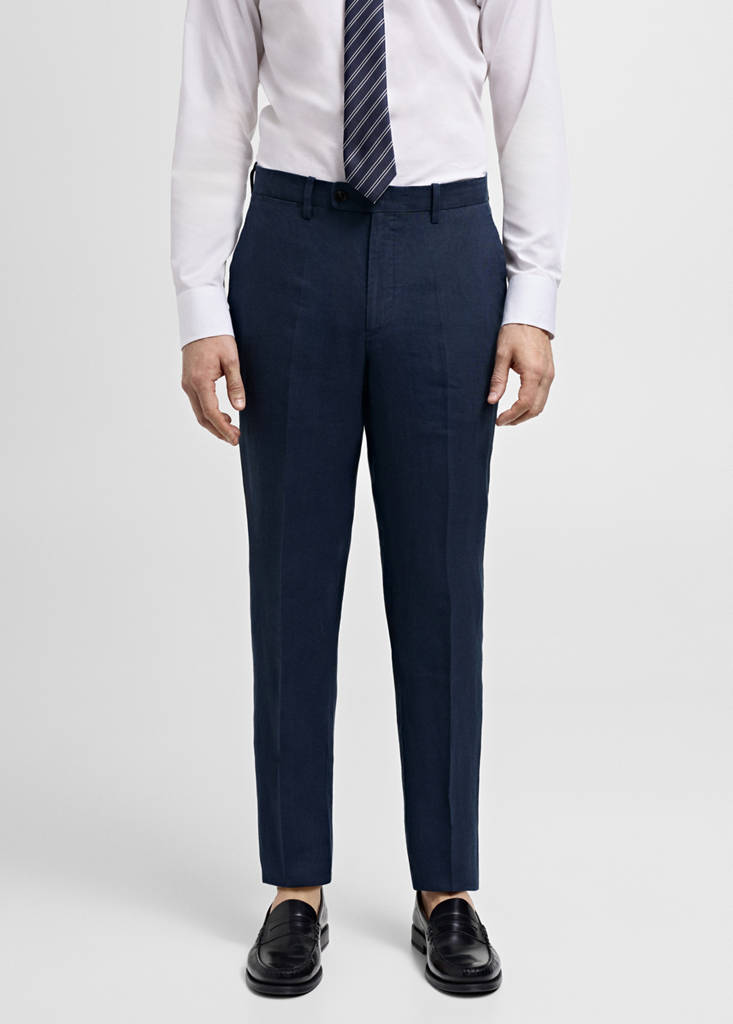 Slim fit. Tkanina w 100% z lnu. Średni stan. Szlufki na pasek. Zapięcie z przodu na guzik, haftkę i zamek. Dwie kieszenie z przodu. Dwie tylne kieszenie z lamówką. Kolekcja krawiecka. Detal w postaci zaprasowanego kantka z przodu i z tyłu
