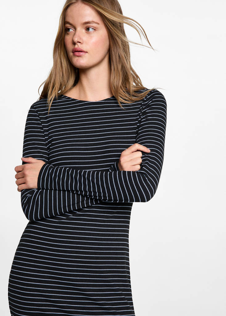 Lureksowe detale. Prosty krój. Długi fason. Nadruk w paski. Okrągły dekolt. Długi rękaw. Bez zapięcia. Boczne rozcięcie na dole