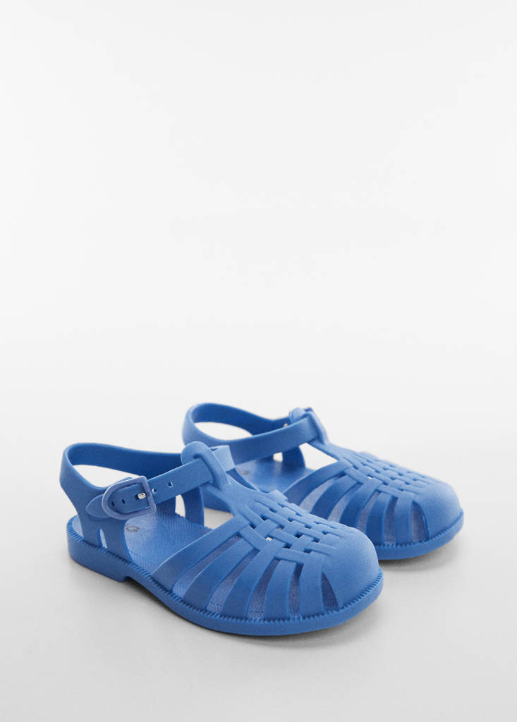 Ponta redonda. Abertura à frente. Liso. Fecho de fivela. Coleção de banho