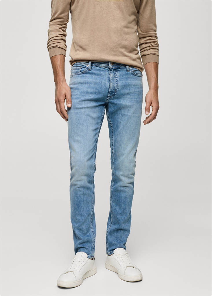 Slim fit. Tecido de mistura de algodão sustentável. Estilo de calças de ganga. Presilhas para cinto. Fecho de zíper e botão. Dois bolsos laterais. Bolso porta-moedas. Dois bolsos de patch na parte de trás. Coleção de Básicos. Passantes para cinto