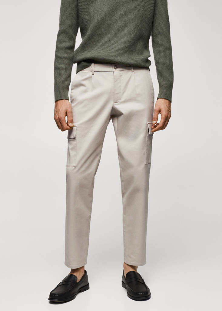 Slim fit. Tecido misto de algodão. A cor bege só está disponível 'online'. Desenho cargo. Fecho de zíper e botão. Presilhas para cinto. Detalhe de prega frontal. Dois bolsos de aplicação com aba na perna. Barra reta
