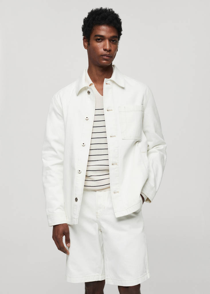 Conjunto disponível como 'total look'. Pormenores pespontados. Fecho de botões metálicos à frente. Manga comprida com punhos abotoados. Bolso de aplicação no peito. Barra reta. Gola clássica. Tecido 100% algodão. Dois bolsos de debrum na parte da frente