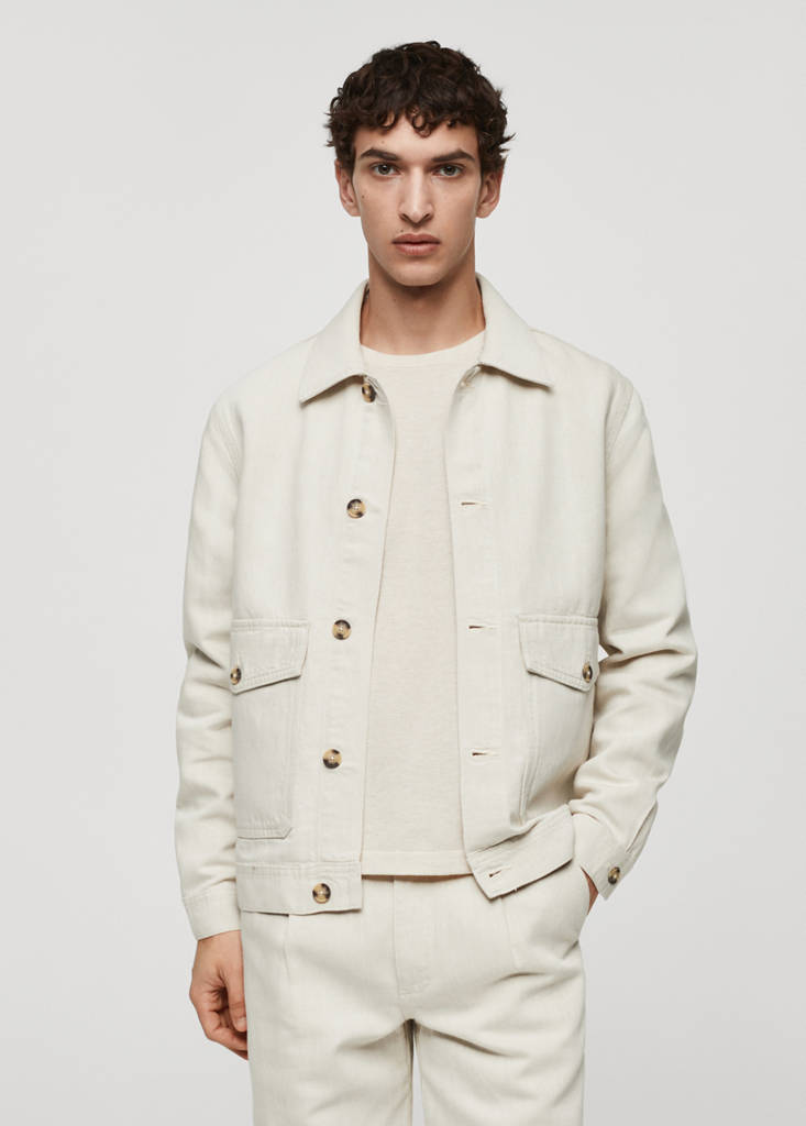 Campanha Antoine Griezmann. Tecido mistura de algodão e linho. Gola de camisa. Dois bolsos de aba com botão na parte da frente. Manga comprida com punhos abotoados. Tiras laterais ajustáveis com botão. Barra reta. Fecho frontal com botões