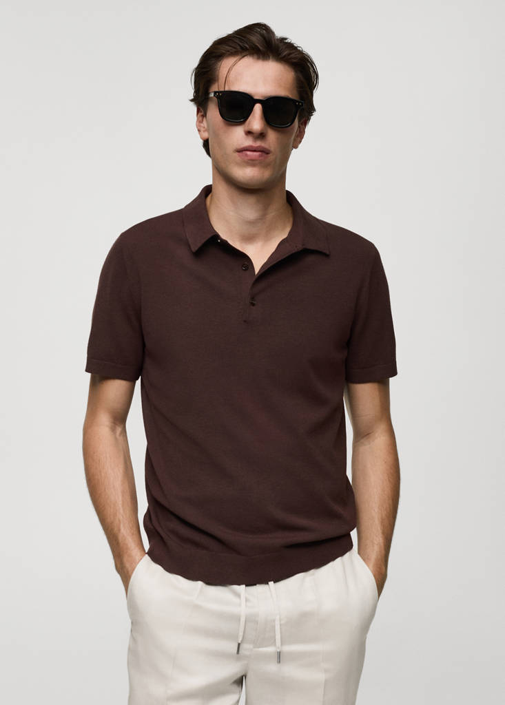 Slim fit. Malha fina. Gola polo. Fecho de botões na gola. Manga curta. Barra reta. As cores turquesa e castanho-café só estão disponíveis 'online'. Terminações caneladas na gola, manga e base. Terminações caneladas elásticas
