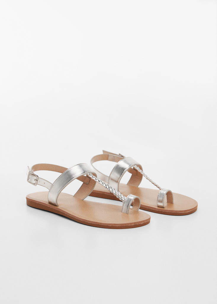 Acabamento metalizado. Modelo entrançado. Abertura frontal. Flat. Fecho de fivela