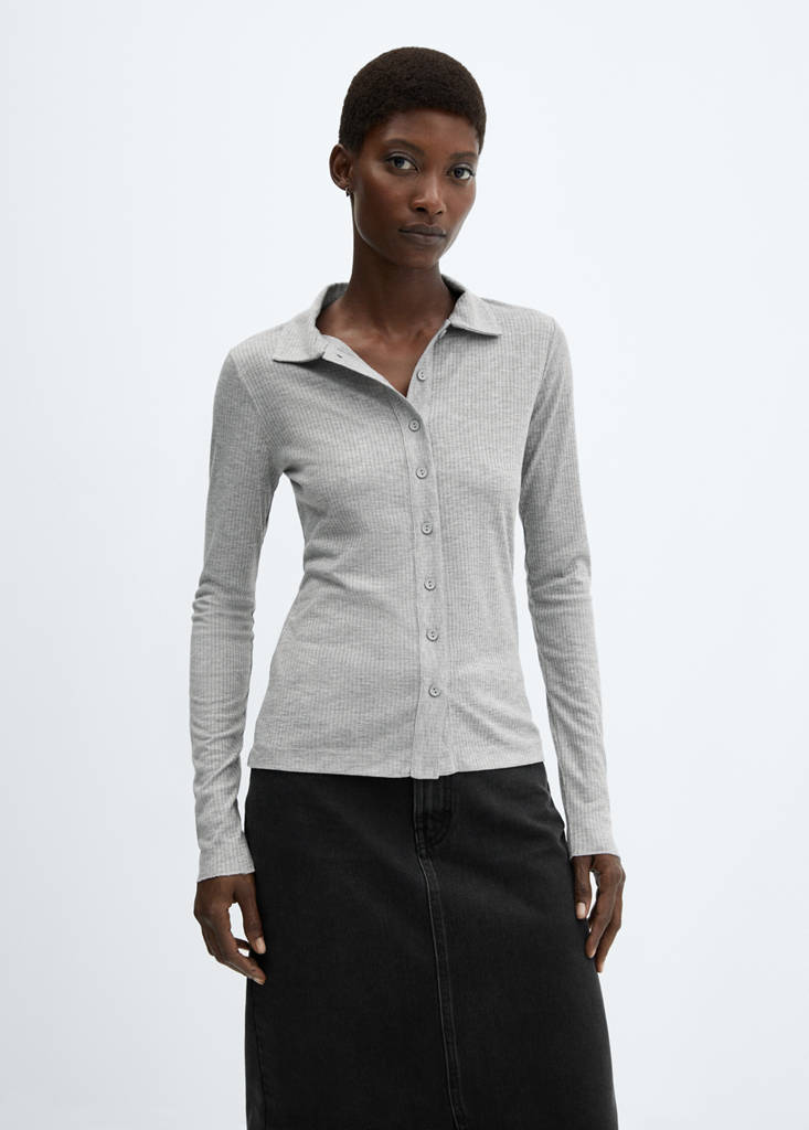 Tecido de malha canelada. Malha fina. Gola de camisa. Manga comprida. Fecho de botões na parte da frente. 'Looks' de escritório