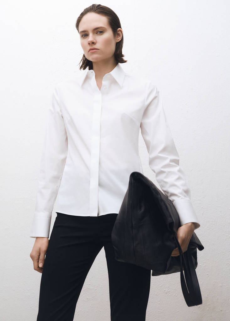 Tecido de popeline de algodão. Design ajustado. Gola de camisa. Manga comprida com punhos abotoados. Fecho frontal com botões. Coleção Selection