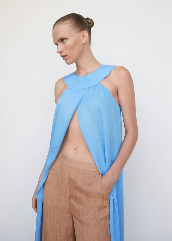 Design plissado. Design reto. Design longo. Gola halter. Sem mangas. Fecho de correr na parte posterior. Abertura frontal. Total look. Coleção festa, cerimónia e comunhão