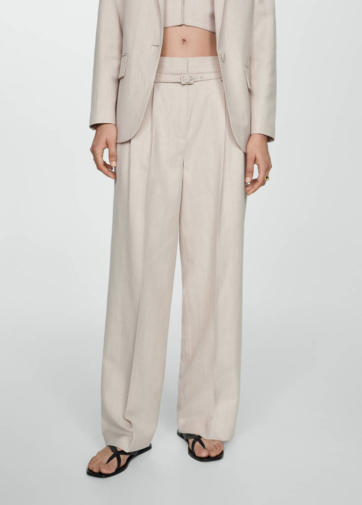 Tecido com mistura de linho. Tecido fluido. Estilo fato. Design wideleg. Design longo. Estampado de risca diplomática. Fecho de botão oculto, gancho e fecho de correr. Passantes para cinto. Cinto removível. Dois bolsos laterais. Dois bolsos embutidos na parte de trás. Total look