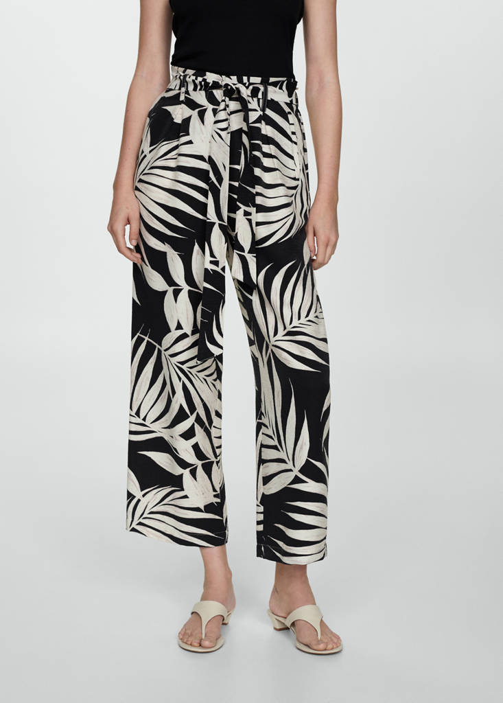 Tecido fluido. Cintura média. Design wideleg. Design longo. Dois bolsos frontais. Passantes para cinto. Fecho de botão oculto, gancho e fecho de correr. Laço decorativo. Disponível Plus. Design estampado
