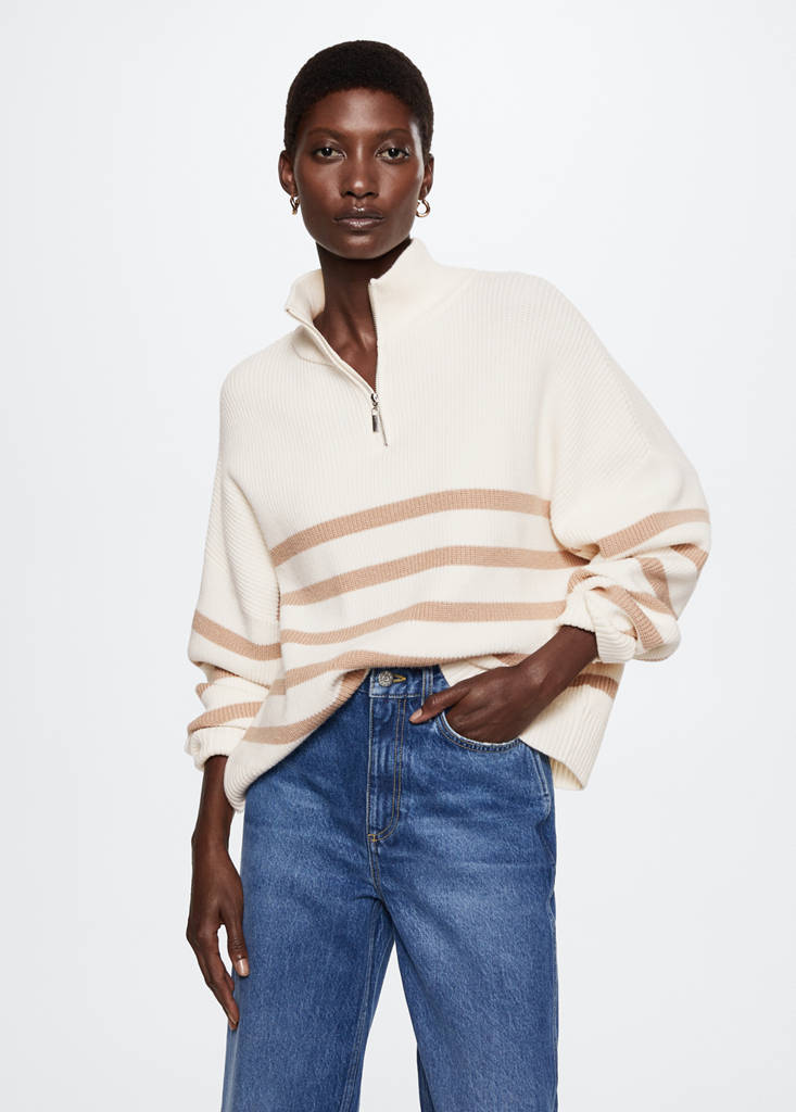 Malha de ponto grossa. Gola Perkins. Fecho na gola. Design oversize. Design padrão. Design reto. Estampado às riscas. Gola perkins com fecho de correr. Manga comprida. Costura do ombro caída. Disponível Plus. Esta peça pertence ao nosso Guia de Prendas