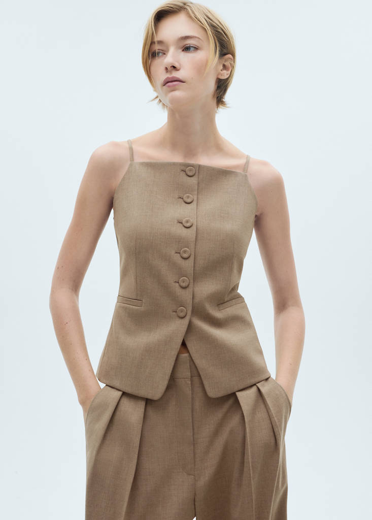 Sem mangas. Alças finas. Dois bolsos de ribete frontais. Fecho frontal com botões. Total look. Coleção Selection. Tecido mistura de lã. Estilo fato. Gola halter. Design reto. Design ajustado