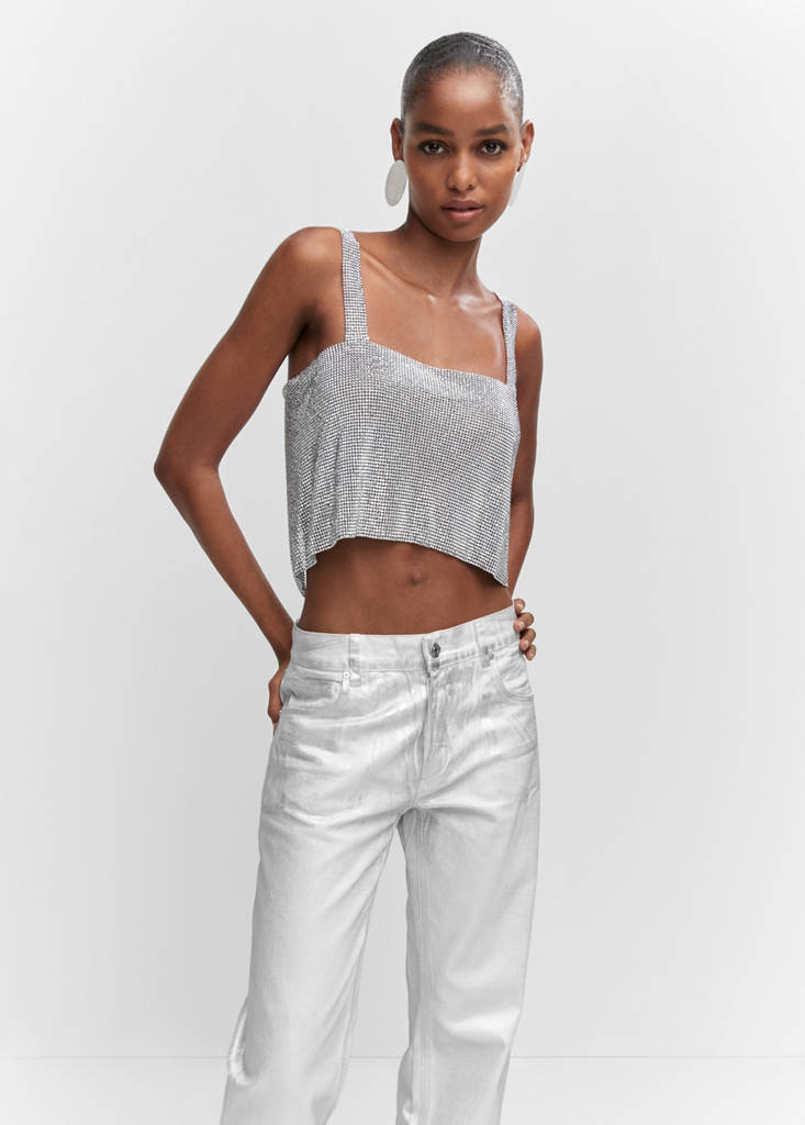 Tecido de malha. Metal. Aplicação de cristais. Design reto. Design crop. Gola reta. Alças largas. Costas abertas. Fecho de corrente e mosquetão. Festival Season