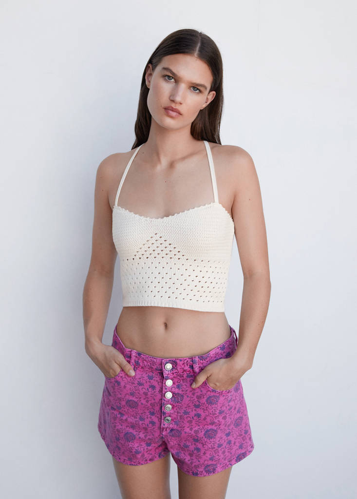 Malha de ponto. Pormenores rendados. Design curto. Design reto. Alças finas. Alças cruzadas nas costas. Tecido 100% algodão