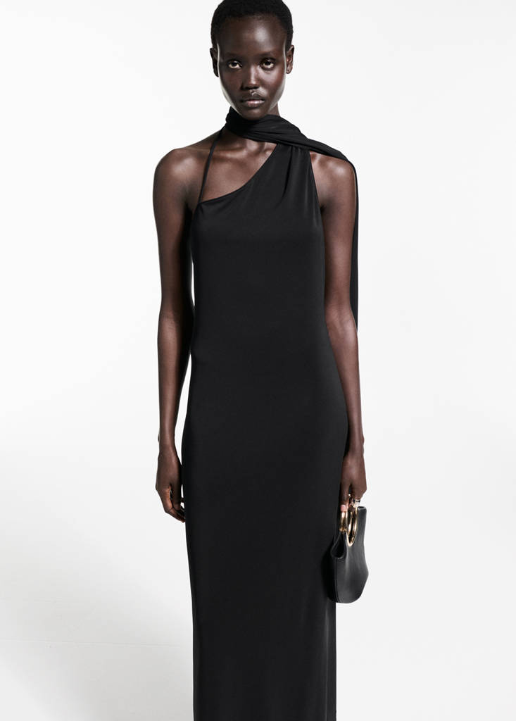 Design assimétrico. Tecido fluido. Design ajustado. Design longo. Decote assimétrico. Gola com forma de gargantilha. Alça fina. Sem fecho. Abertura lateral. Coleção festa, cerimónia e comunhão