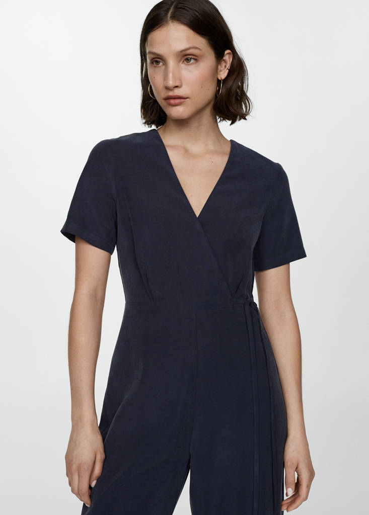 Tecido fluido. Design longo. Design reto. Decote em V cruzado. Manga curta. Fecho de correr na parte posterior. Fecho de laço cruzado