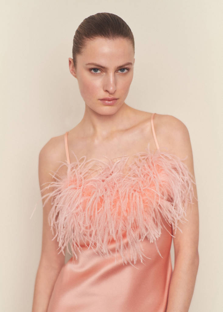 Elegante, sofisticada e favorecedora. Esta peça com estilo de ‘lingerie’ acetinada e decote caicai adornado com penas é a opção ideal para os eventos da estação. Tecido acetinado. Design longo. Decote quadrado. Sem mangas. Alças finas ajustáveis. Sem fecho. Pormenor de penas. Coleção festa, cerimónia e comunhão. Os artigos da coleção CAPSULE podem ser trocados ou devolvidos no prazo de 14 dias a contar a partir da data de envio. Design ajustado