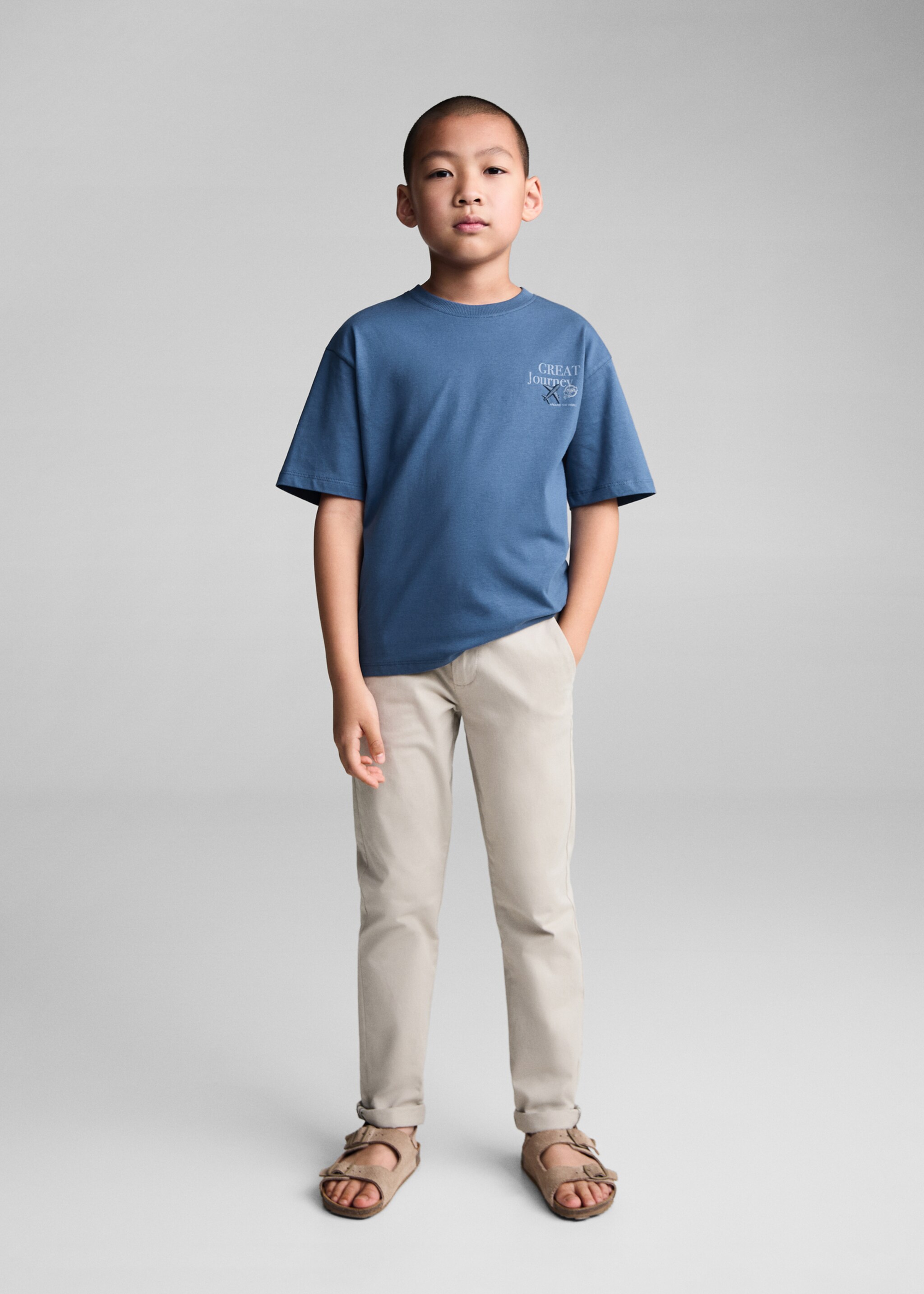 Boys' t-shirts are one of the must-have items in any children's wardrobe, as they are the basis of practically any look for your kids. At Mango Outlet we have a wide variety of children's t-shirts and polo shirts where you can choose the option that best suits your needs. If you are looking for cheap basic children's t-shirts, in our catalogue we have a wide variety of garments in different colours that you can use perfectly as basic wardrobe pieces. For example, our white children's t-shirts are ideal to combine under sweatshirts, cardigans or jumpers, although you can also choose other colours such as black, brown or even a green children's t-shirt, also very easy to match. On the other hand, we have a wide variety of polo shirts and t-shirts for boys with original designs for a more daring and youthful look. At Mango Outlet we have boys' t-shirts at the best prices for any time of the year, whether you need clothes for winter, summer or in-between seasons. For the colder months, our boys' long-sleeved t-shirts will become your child's best allies, as they are made with high quality fabrics that will allow him great freedom of movement during playtime. If, on the other hand, you want to buy children's short-sleeved T-shirts at unbeatable prices, in our shop you will be able to buy fresh and light items that favour the perspiration and comfort of your child. Choose your favourite garment and get your cheap children's t-shirts now, don't miss out!