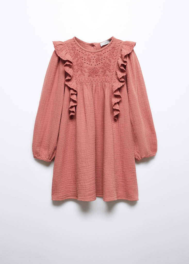 Short design. Embroidered detail. Pleated detail. Ruffle detail. Round neck. Long sleeves. Back closure. Press-stud fastening at the back